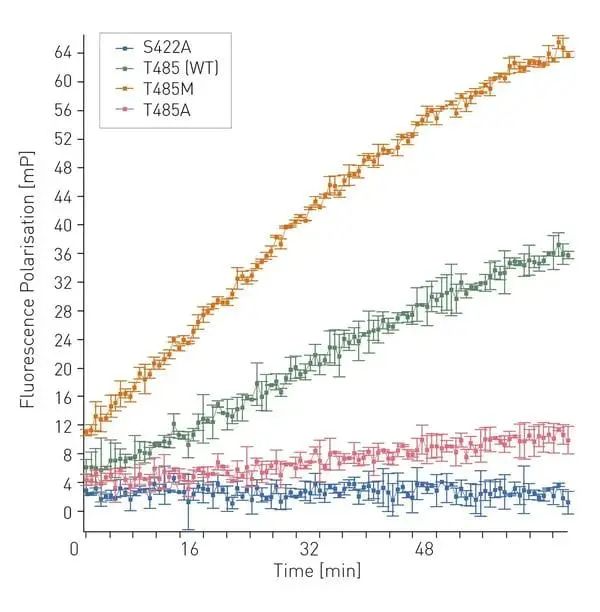 圖 2 顯示了野生型 PBP5(WT,即 PBP5 T485)隨著時間的推移與 BOCILLIN 的結(jié)合情況,通過 FP 值的增加(綠色曲線)可觀察到。正如預期,催化不活躍的 PBP5 S422A 變體沒有與 BOCILLIN 結(jié)合(藍色曲線),因為 β-內(nèi)酰胺類藥物嚴格要求與活性位點絲氨酸結(jié)合。