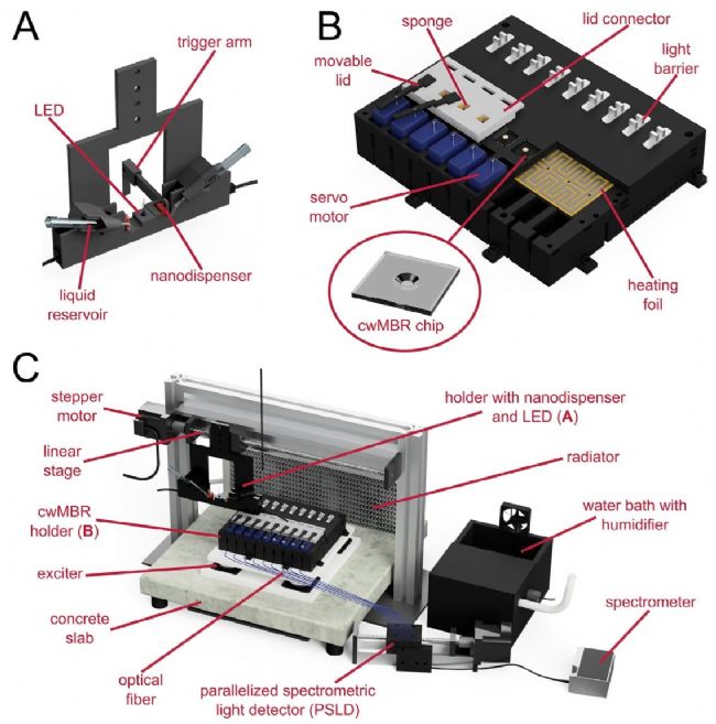 圖 1 自動(dòng)化毛細(xì)管波微型生物反應(yīng)器(cwMBR)平臺(tái)(A)Pipejet納升分液裝置與 LED 燈支架:支架上固定有2臺(tái)Pipejet納升分液裝置,每臺(tái)分液裝置均連接有作為儲(chǔ)液池的移液器吸頭(通過(guò)管路連接)。LED 燈位于兩臺(tái)分配器之間,(B)3D 打印 cwMBR 支架(含芯片、加熱膜、光屏障及伺服控制活動(dòng)蓋):該支架最多可容納 9 個(gè)線性排列的 cwMBR 芯片。(C)自動(dòng)化 cwMBR 平臺(tái)整體示意圖:3D 打印 cwMBR 支架放置于振蕩平臺(tái)上,通過(guò)垂直振蕩實(shí)現(xiàn)混合;Pipejet納升分液裝置連接至帶步進(jìn)電機(jī)的線性滑臺(tái),可在 cwMBR 芯片上方精準(zhǔn)移動(dòng)。透光強(qiáng)度的測(cè)量由平行光譜光檢測(cè)器完成,該檢測(cè)器通過(guò)光纖與 cwMBR 芯片相連。所有設(shè)備均置于恒溫培養(yǎng)箱內(nèi),培養(yǎng)箱通過(guò)散熱器與恒溫器加熱,并通過(guò)水浴中的超聲波加濕器維持濕度。