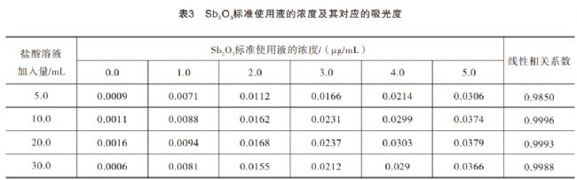 3標(biāo)準(zhǔn)溶液(100μg/mL)0.0mL、1.0mL、2.0mL、3.0mL、4.0mL、5.0mL,配制4組相同含量的標(biāo)準(zhǔn)溶液系列,于4組標(biāo)準(zhǔn)溶液系列中分別加入鹽酸溶液(1+1)5.0mL、10.0mL、20.0mL、30.0mL后,用水稀釋至標(biāo)線,測(cè)定溶液中Sb