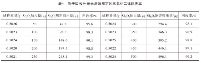 由表4可知,用原子吸收分光光度法測(cè)定樣品中三氧化二銻含量,回收率在95.6%~99.2%之間,說(shuō)明該方法在測(cè)定三氧化二銻含量過(guò)程中并不存在干擾因素,完全可以滿足定量分析要求。