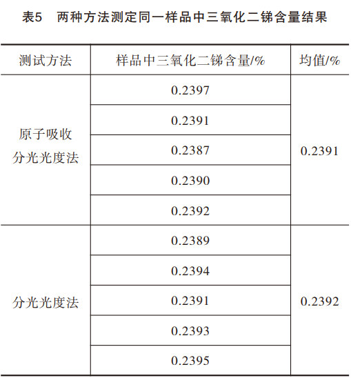 應(yīng)用原子吸收分光光度法與分光光度法分別測(cè)試同一玻璃樣品中三氧化二銻含量,每種方法進(jìn)行5個(gè)平行樣品的測(cè)定,該玻璃標(biāo)準(zhǔn)樣品三氧化二銻含量為0.24%,測(cè)試結(jié)果見表5。