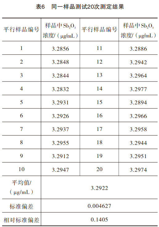 依據(jù)原子吸收分光光度法測(cè)試同一樣品20次,分析其測(cè)定精確度,測(cè)定結(jié)果見表6。