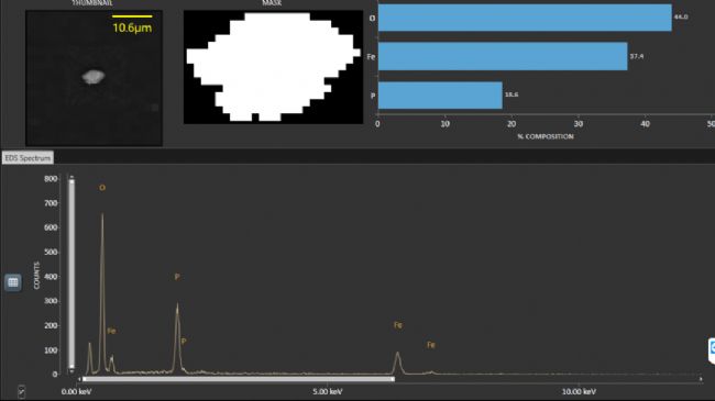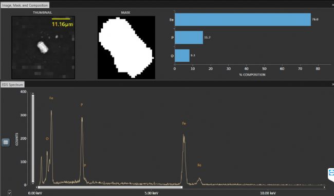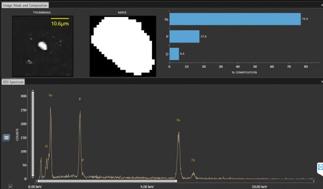 如下表所示為使用篩分法收集樣品,并使用 Phenom ParticleX 測試磷酸鐵鋰中金屬異物的結(jié)果。可以看出,在篩分法中,磷酸鐵鋰主材占據(jù)了絕大部分顆粒,其平均氧含量為 44.2%,而磷化鐵和氧化鐵的含量較少,磷化鐵中氧含量較少,僅為 10.6%,而氧化鐵中并不含有磷的成分。