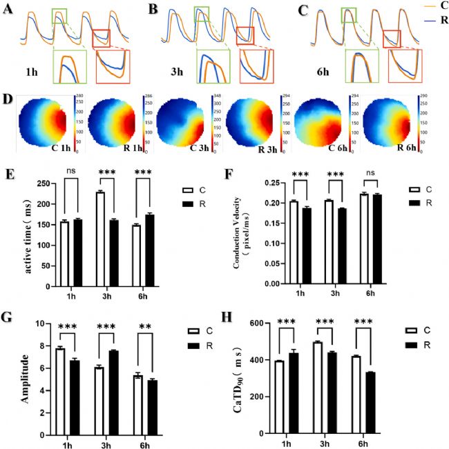 心肌細(xì)胞與其他細(xì)胞最顯著區(qū)別在于它們能夠自主跳動。觀察其電生理功能的變化有助于揭示炎癥引發(fā)的心臟損傷的新機制。CaTD90 指的是鈣瞬變持續(xù)到90%所用的時間。結(jié)果表明,與對照組相比,在微波輻射后3小時和6小時,Ca2+激活時間先減少后增加(p < 0.001),Ca2+激活速度在1小時和3小時顯著降低(p < 0.001)。在放療組中,微波輻射后1小時、3小時和6小時,Ca2+瞬變幅度先降低后升高,Ca2+激活幅度在微波輻射后1小時、3小時和6小時增加。CaTD90先增加后減少(p < 0.001)。