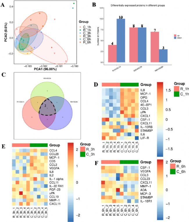研究以30個樣本為對象,經(jīng)內(nèi)部質(zhì)量控制后,主成分分析顯示各組樣本在低維空間呈簇狀分布。差異蛋白數(shù)量上,炎癥因子升高樣本先增后緩減,降低樣本數(shù)量減少。三個時間點檢測到CXCL11和CCL3兩種高表達差異蛋白,未來將持續(xù)關(guān)注。繪制微波輻射后1、3、6小時92種炎癥因子表達熱圖,以紅藍顏色階梯展示表達高低及聚集模式。放療組中,1、3小時IL-6升高、MCP-1降低;6小時CCL4升高、VEGFA降低,且VEGFA升高與CCL3降低更顯著。上述表達動態(tài)與此前結(jié)構(gòu)功能異常一致。