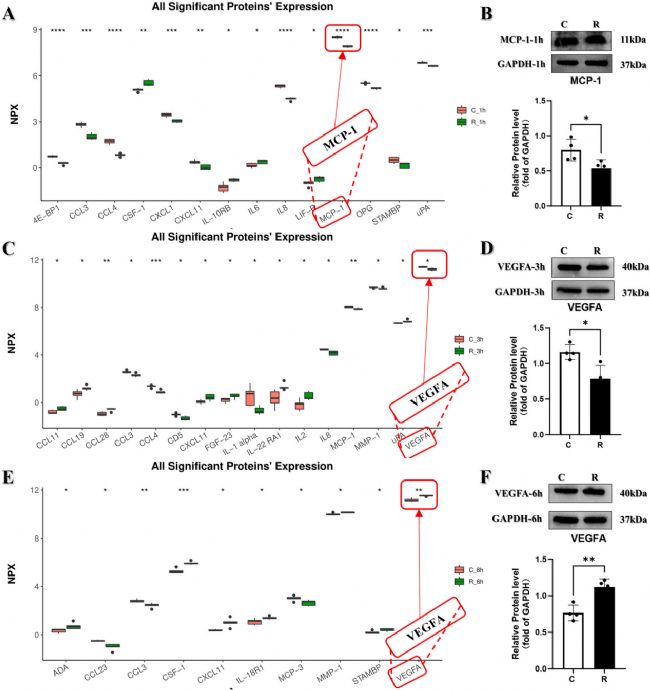 此部分研究繪制各時間點差異表達蛋白質(zhì)箱形圖,清晰展示炎癥因子中位數(shù)、四分位距及異常值,并選取各時間點高表達蛋白進行WB檢測。微波輻射1小時,輻射組MCP-1定量顯著低于對照組(p<0.05);3小時,VEGFA蛋白含量顯著降低(p<0.05);6小時,VEGFA表達顯著增加(p<0.01)。結(jié)合多種檢測方法,全面分析輻射后1、3、6小時炎癥因子及MCP-1、VEGFA的表達,發(fā)現(xiàn)部分炎癥因子存在顯著動態(tài)變化。后續(xù)將分析這些因子對心肌細(xì)胞的影響,及其與損傷效果時間線的關(guān)聯(lián),以深入挖掘損傷機制。