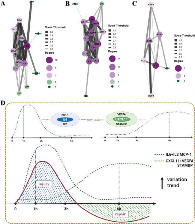 研究探討微波輻射后1、3、6小時iPSC-CMs中炎癥因子差異表達及關(guān)鍵因子變化。PPI網(wǎng)絡(luò)核心節(jié)點隨時間轉(zhuǎn)換:1小時為IL-6,3小時為IL-8,6小時為CXCL11。多因素分析揭示炎癥修復(fù)網(wǎng)絡(luò)動態(tài)平衡,iPSC-CMs通過上述核心因子時間性轉(zhuǎn)換調(diào)節(jié)炎癥反應(yīng)。CCL3持續(xù)降低,CXCL11先降后升,IL-6僅1小時升高,IL-8、MCP-1 1-3小時降低,VEGFA 3小時降、6小時升。結(jié)合損傷效應(yīng)梳理機制,各時間點因子呈特征性變化,反映炎癥反應(yīng)的時序調(diào)控規(guī)律。