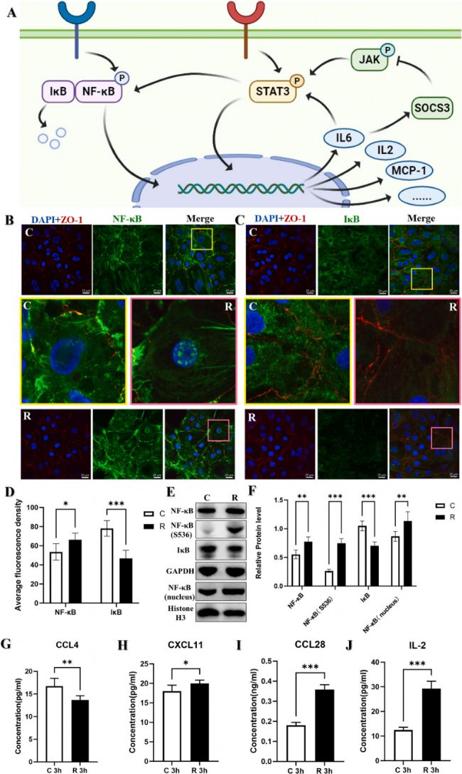 本研究用GO和KEGG分析差異炎癥分子:1小時GO富集“炎癥反應(yīng)”等,KEGG凸顯NF-κB通路驅(qū)動急性炎癥;3小時GO為“免疫細(xì)胞趨化”,NF-κB協(xié)同趨化因子,IL-8異常致細(xì)胞損傷;6小時炎癥減弱,進入修復(fù)階段。輻射后NF-κB核轉(zhuǎn)移,IκB降解,證實經(jīng)典通路時相性激活。ELISA驗證CCL28、IL-2、CXCL11升高,CCL4降低。研究揭示微波輻射通過NF-κB通路引發(fā)“損傷-修復(fù)”平衡,早期IL-6致?lián)p傷,后期CXCL11/VEGFA介導(dǎo)修復(fù),構(gòu)建多維病理網(wǎng)絡(luò),提供調(diào)控靶點。