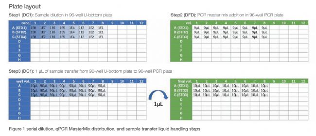 本次qPCR實(shí)驗采用 TaqMan™ 基因表達(dá)預(yù)混試劑(Applied Biosystems, Cat. 4369016),以濃度為 108 ng/mL 的陽性病毒對照作為起始樣本,在 apricot DC1 自動化液體處理工作站上,于 96 孔 U 底板中完成陽性對照的連續(xù)梯度稀釋。每個稀釋度設(shè) 3 個復(fù)孔。具體操作流程如下: