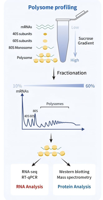 Polysomeprofiling下游產(chǎn)物可進(jìn)行多種檢測:高通量測序分析全局翻譯狀態(tài);RT-qPCR驗證不同條件下特定基因的翻譯狀態(tài);WB/質(zhì)譜驗證翻譯活性,還可分析翻譯調(diào)控因子的功能。