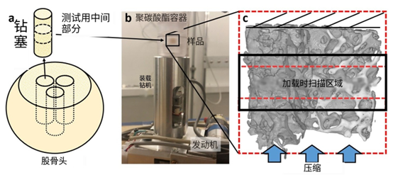 圖為取樣和SR-uCT成像。(a)用鉆鉆從人頭上取下骨塞,并將塞的中間部分鋸下來進行測試。(b)在成像時使用定制的裝載設(shè)備對樣品進行壓縮。(c)X射線掃描FOV的高度小于樣品,因此在裝載過程中只對中間部分(黑盒)進行了成像。在加載之前和之后獲取帶有重疊區(qū)域的兩端以成像整個插頭(紅色虛線盒)。
