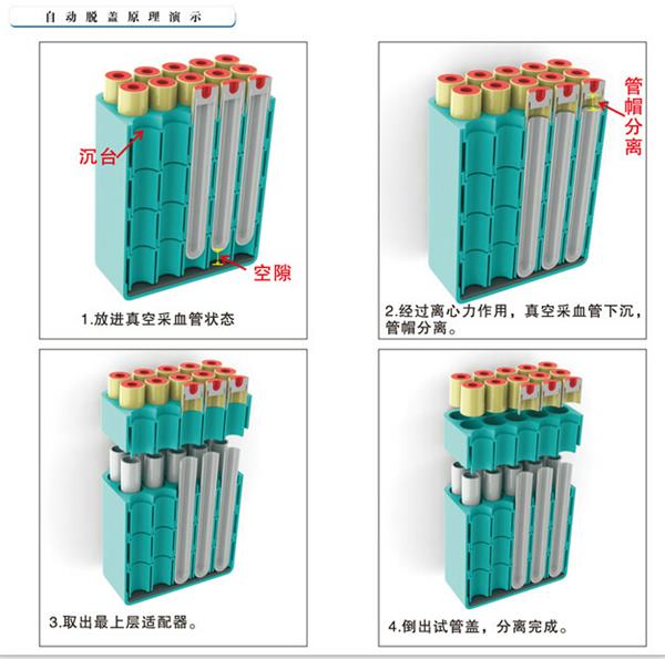 優(yōu)點:(1)離心過程中自動把真空采血管的蓋脫掉,提高工作效率。(2)代替手工脫帽,預(yù)防試劑接觸人體。