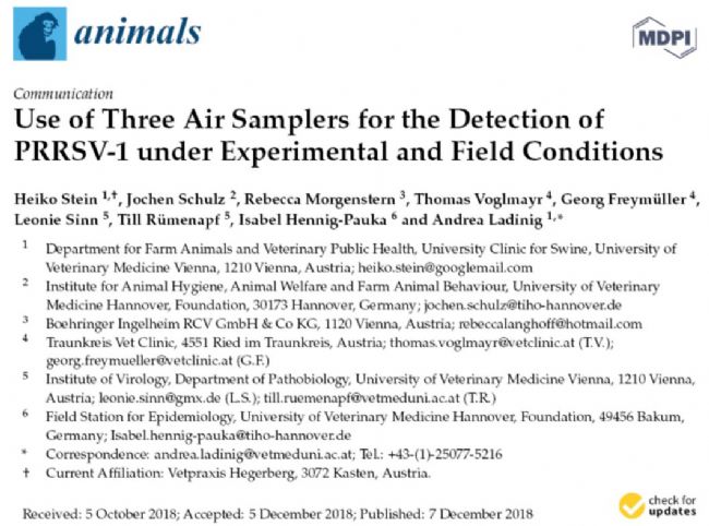 PRRSV病毒為豬繁殖和呼吸綜合征病毒,它引起豬的呼吸性疾病,從而影響豬的產(chǎn)量,對養(yǎng)豬產(chǎn)業(yè)造成很大經(jīng)濟損失。PRRSV病毒分為PRRSV-1(歐洲型)和PRRSV-2(北美型)兩個種類,有研究表明PRRSV-2是可以通過空氣傳播的,但沒有關(guān)于PRRSV-1空氣傳播的研究。近期來自維也納獸醫(yī)大學(xué)的實驗室發(fā)表了一篇文章,比較了三種空氣采集器分別在實驗室和農(nóng)場環(huán)境下,對PRRSV-1病毒的檢測,從而評估三種空氣采集器的采集能力。