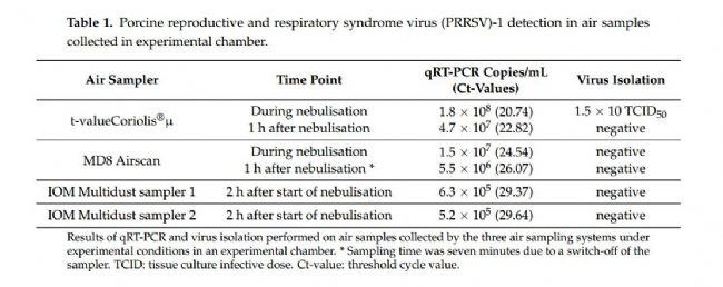 研究者利用一個空氣體積約為68.5 m3的獨立環(huán)境,將PRRSV-1病毒加入到1LPBS溶液中,之后使用冷霧系統(tǒng)噴灑10分鐘,分別使用三種空氣采集器采集,兩個時間采集點,第一個為霧化過程中,第二個為霧化1個小時之后。采集的樣本一經(jīng)過qRT-PCR檢測,通過RNA拷貝數(shù)來評估樣本收集的多少。隔離的病毒加入到MARC-145細胞系中,來看引起細胞系的TCID50值。