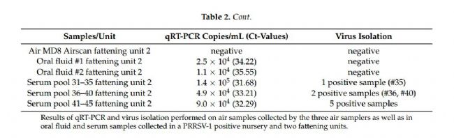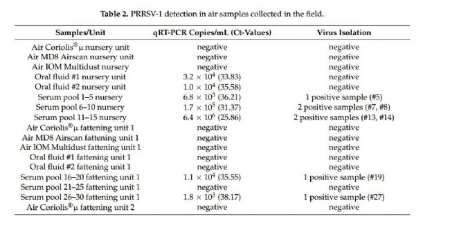 研究者找到了一個PRRSV-1病毒檢測呈陽性的商業(yè)農(nóng)場,空氣采集點包括一個苗圃和2個養(yǎng)殖地。同樣使用三種空氣采集器收集空氣樣本,同時采集了豬的唾液和血清,之后通過qRT-PCR檢測以及病毒隔離到MARC-145細胞系中。