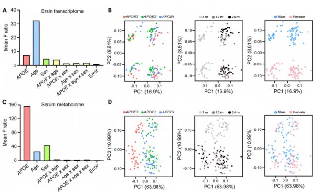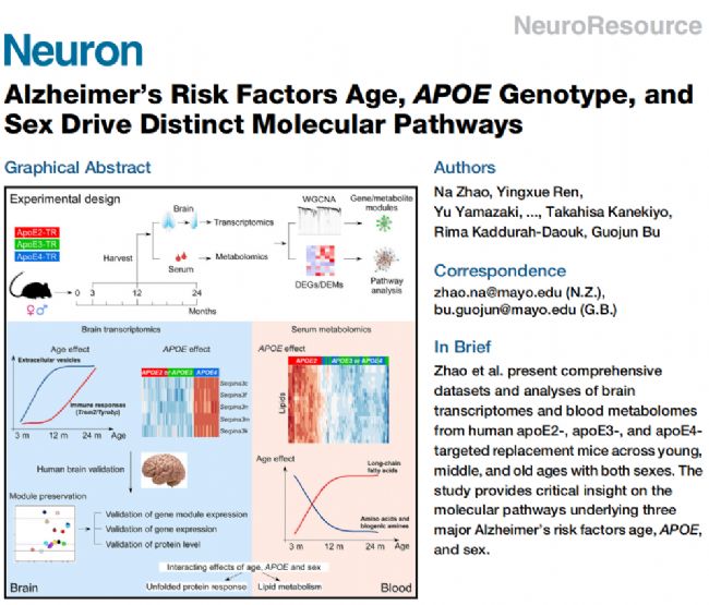 研究中全面地分析人類APOE2、APOE3和APOE4靶向替代小鼠的轉(zhuǎn)錄組和血液代謝組。結(jié)果發(fā)現(xiàn)年齡對Trem2和Tyrobp領(lǐng)導的免疫模塊所強調(diào)的大腦轉(zhuǎn)錄的影響最大,而APOE4與多個Serpina3基因的上調(diào)有關(guān)。重要的是,這些網(wǎng)絡(luò)和基因表達變化在人腦中大多是保守的。最后,觀察到年齡、APOE基因型和性別在未折疊蛋白反應(yīng)途徑上的顯著相互作用。在外圍,APOE2驅(qū)動不同的血液代謝體譜,突出的上調(diào)脂質(zhì)代謝物。研究中確定了AD危險因素的單獨和相互作用的分子途徑,為阿爾茨海默病的研究提供了寶貴的資源。