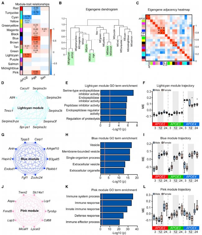 對與APOE基因型相關(guān)的模塊進行了功能注釋,并在每個模塊中確定了前10個模塊內(nèi)樞紐基因。在lightcyan模塊中的前10個樞紐基因主要來自Serpina3基因家族,包括Serpina3c、Serpina3f、Serpina3k、Serpina3l-ps、Serpina3m和Serpina3n(圖2D)。該模塊中的基因被富集,以調(diào)節(jié)內(nèi)肽酶抑制劑的活性(圖2E)。與APOE2或APOE3基因型相比,APOE4中的LightCyan模塊Eigengene(ME)上調(diào)(圖2F)。進一步研究了與老化相關(guān)的模塊。藍色模塊與年齡顯著相關(guān),在12個月和24個月時上調(diào)(圖2I)。該模塊中的基因被富集到與細胞外囊泡(EVS)有關(guān)的過程中)(圖2H)。已知在EVS中檢測到該模塊中的頂級樞紐基因,包括Anln、 Arhgef10 、 B3galt5、Csrp1、Endod1、Plekhb1和Zcchc24(圖2G)。此外,粉紅色模塊也與衰老顯著相關(guān),與3個月和12個月相比,24個月的衰老被上調(diào)(圖2L)。該模塊中的基因被富集用于免疫應(yīng)答(圖2K),具有頂級樞紐基因,包括Trem2、Tyrobp和CD68,所有這些都涉及大腦中的小膠質(zhì)細胞功能和免疫反應(yīng)。