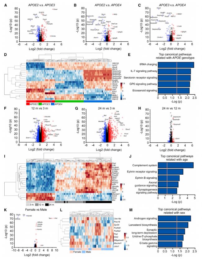 在1,813個基因中觀察三個APOE基因型之間的差異表達。受APOE基因型影響的DEGS顯著富集于白細胞介素-7(IL-7)信號、5-羥色胺受體信號、GP6信號和eicosanoid信號通路(圖3E)。在12個月與3個月,或24個月與3個月之間,約有3000個DEGS被發(fā)現(xiàn),而24個月至12個月之間的DEGS數(shù)量低于500,這表明大腦轉(zhuǎn)錄的最顯著變化出現(xiàn)在3至12個月的年齡(圖 3F-3H)。受年齡影響的DEGS在Ephrin受體信號等途徑中顯著富集(圖3J)。與性別相關(guān)的DEGS在雄激素信號、拉諾醇生物合成和突觸長期抑制等途徑中顯著富集(圖3M)。前10位DEGS的分層聚類沒有成功地根據(jù)性別分離樣本(圖3L),表明這些基因也可能受到年齡或APOE基因型等其他因素的調(diào)控。