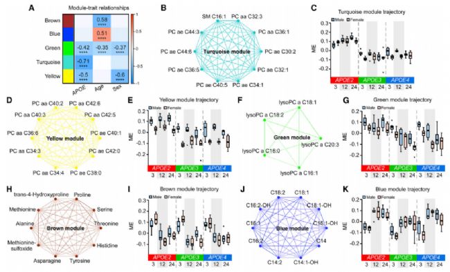 血清代謝物的WGCNA分析確定了五個共表達代謝物模塊(圖4A)。表明APOE2通過上調(diào)脂質(zhì)代謝來驅(qū)動不同的血清代謝組學特征。此外,黃色和綠色模塊也與性別顯著相關(guān),女性的表達低于男性(4D-4G)。進一步研究了與年齡顯著相關(guān)的模塊,結(jié)果表明,衰老對血清代謝組學的影響是氨基酸和生物胺的下調(diào)和酰基肉堿特別是長鏈脂肪酸的上調(diào)。