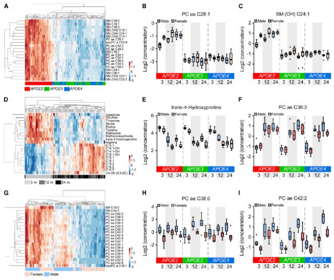 在三種APOE基因型中共篩選出130個DEM。(圖5A-5C)。在對年齡的研究中,前20個DEM的層次聚類成功地將3個月的血清樣本與12個月和24個月的血清樣本分離,主要是氨基酸和生物胺的下調(diào)和3個月后酰基肉堿的上調(diào)(圖5H-5K)。在對性別的研究中,前20個DEM都是脂類,但這些DEM的層次聚類并沒有明確區(qū)分性別。