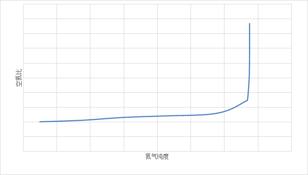 通過良好的產(chǎn)品設(shè)計(jì)、生產(chǎn)工藝可實(shí)現(xiàn)純度在98-99.5%之間的氮?dú)。空氣?8%的氮?dú)狻?1%的氧氣和1%的其他氣體組成。通過分離得到的氮?dú),純度要求越高,需要的空氣也越多。純度要求越低,所需空氣就越少。而空氣消耗與氮?dú)饧兌戎g的關(guān)系不是線性的,詳細(xì)見下圖。