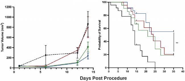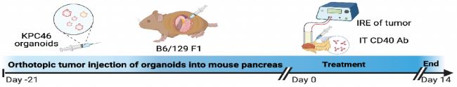 Rebekah R White團隊于今年1月在J IMMUNOTHER CANCER期刊上發(fā)表了一篇題為“Treatment of pancreatic cancer with irreversible electroporation and intratumoral CD40 antibody stimulates systemic immune responses that inhibit liver metastasis in an orthotopic model”的文章,研究團隊先構(gòu)建了胰腺癌類器官,再將其轉(zhuǎn)移至小鼠體內(nèi)成瘤,然后采用不可逆電穿孔(IRE)和CD40激動性抗體(CD40 Ab)治療荷瘤小鼠模型,生存分析顯示IRE+CD40單抗聯(lián)合治療可使其中位生存期提高到35天以上。