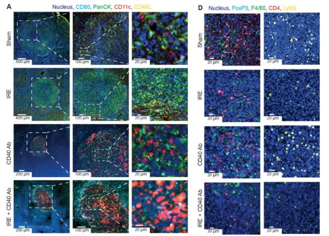 因為胰腺所處的特殊“地理位置”,晚期極易出現(xiàn)轉(zhuǎn)移,其中胰腺癌肝轉(zhuǎn)移最為常見。為了進一步評估癌癥轉(zhuǎn)移部位的免疫學(xué)變化,研究團隊運用多重?zé)晒饷庖呓M化技術(shù)(mIHC)分析模型荷瘤小鼠肝臟組織,染色結(jié)果顯示IRE+CD40Ab治療后轉(zhuǎn)移肝結(jié)節(jié)內(nèi)有抗腫瘤免疫微環(huán)境。