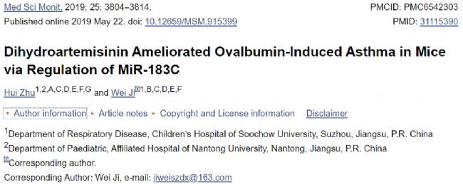 來自蘇州大學(xué)兒童醫(yī)院呼吸內(nèi)科的研究人員在《MedicalL Science Monitor》期刊上發(fā)表了題為“Dihydroartemisinin Ameliorated Ovalbumin-Induced Asthma in Mice via Regulation of MiR-183C”的論文。