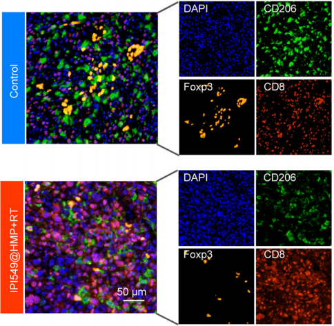 為了更好地觀察腫瘤切除手術(shù)前后免疫微環(huán)境的變化以及納米藥物IPI549@HMP增強(qiáng)腫瘤免疫的療效,研究團(tuán)隊(duì)運(yùn)用Absin五色多重?zé)晒饷庖呓M化染色試劑盒(鼠兔通用二抗)——abs50013進(jìn)行多染,結(jié)果顯示:與未治療的腫瘤相比,切除手術(shù)治療的腫瘤中CD45+免疫細(xì)胞的滲透顯著增加,其中大部分是CD11b+髓系細(xì)胞,且術(shù)后腫瘤的增殖指數(shù)(Ki-67)和缺氧指數(shù)(HIF-α)也比術(shù)前要高得多(圖2);進(jìn)行IPI549@HMP聯(lián)合放療以后,腫瘤微環(huán)境中抑制荷瘤宿主的抗腫瘤免疫反應(yīng)的Treg細(xì)胞(FOXP3+)和促進(jìn)免疫逃逸的M2型巨噬細(xì)胞(CD206+)較治療前顯著減少,而對腫瘤細(xì)胞具有殺傷作用的CD8+T細(xì)胞明顯增多(圖3),證實(shí)了IPI549@HMP能夠增強(qiáng)術(shù)后放療對荷瘤小鼠的治療效果。