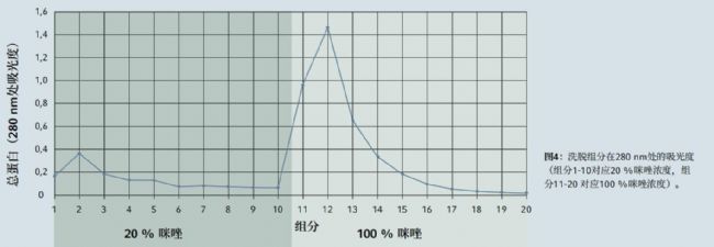 使用 20 % 咪唑洗脫緩沖液從親和柱中獲得總共 10 個(gè)組分。這部分旨在去除雜質(zhì)。隨后用 100 % 咪唑的緩沖液洗脫 10個(gè)組分,目的是回收純化的蛋白質(zhì)。為了鑒別相關(guān)組分,測(cè)量了它們?cè)?280 nm 處的吸光度。