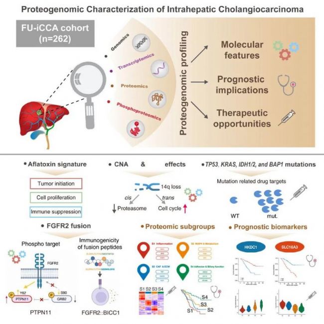 2021年底,復(fù)旦大學(xué)附屬中山醫(yī)院樊嘉院士團(tuán)隊(duì)高強(qiáng)教授、中科院上海藥物所周虎研究員、中科院分子細(xì)胞科學(xué)卓越創(chuàng)新中心高大明研究員等合作在期刊Cancer Cell發(fā)表了題為“Proteogenomic characterization identifies clinically relevant subgroups of intrahepatic cholangiocarcinoma”的研究論文,在該研究中,樊嘉院士團(tuán)隊(duì)發(fā)現(xiàn)TP53、KRAS、FGFR2、IDH1/2、BAP1突變(融合)是肝內(nèi)膽管癌的主要驅(qū)動(dòng)基因變異。