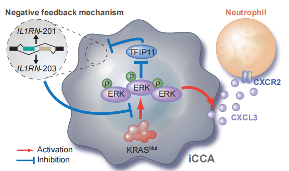研究團(tuán)隊(duì)使用了大量的高通量數(shù)據(jù),包括來(lái)自iCCA隊(duì)列和公共數(shù)據(jù)庫(kù)的完整外顯子組測(cè)序(WES)、批量RNA測(cè)序(RNA-seq)和BD單細(xì)胞測(cè)序(scRNA-seq),這些分析結(jié)果證實(shí)了KRAS突變和腫瘤之間的因果聯(lián)系,即促進(jìn)炎癥是iCCA的關(guān)鍵驅(qū)動(dòng)因素。研究團(tuán)隊(duì)發(fā)現(xiàn)了一個(gè)新的炎癥檢查點(diǎn),該檢查點(diǎn)由IL1RN的mRNA選擇性剪接產(chǎn)生,它可以通過(guò)調(diào)節(jié)中性粒細(xì)胞的募集和極化來(lái)抑制KRAS突變介導(dǎo)的炎癥信號(hào)級(jí)聯(lián)反應(yīng)、腫瘤進(jìn)展和ICI抵抗。這些發(fā)現(xiàn)表明,IL1RN選擇性剪接可能是治療KRAS突變癌癥的有效靶點(diǎn)。
