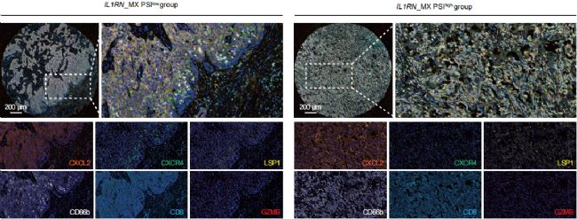 圖:與IL1RN_MX PSIlow KRAS突變樣本相比,IL1RN_MX PSIlow KRAS突變樣本的CXCR4+和LSP1+中性粒細(xì)胞密度略有下降,而CXCL2+中性粒細(xì)胞和GZMB+CD8+T細(xì)胞密度增加