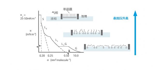 W.D.Harkins于1952年提出了一些簡明的術(shù)語,用于對脂肪酸的不同單分子層相進行分類。單分子層主要以氣態(tài)(G)存在,壓縮時可經(jīng)相變到液體膨脹狀態(tài)(L1),再進一步壓縮時,L1向液態(tài)壓縮狀態(tài)(L2)轉(zhuǎn)變,在更高的密度下,單分子層最終轉(zhuǎn)變成固態(tài)(S)。如果單分子層在達到固態(tài)后進一步壓縮,則單分子層會塌陷成一個三維結(jié)構(gòu),坍塌導致表面壓迅速降低。