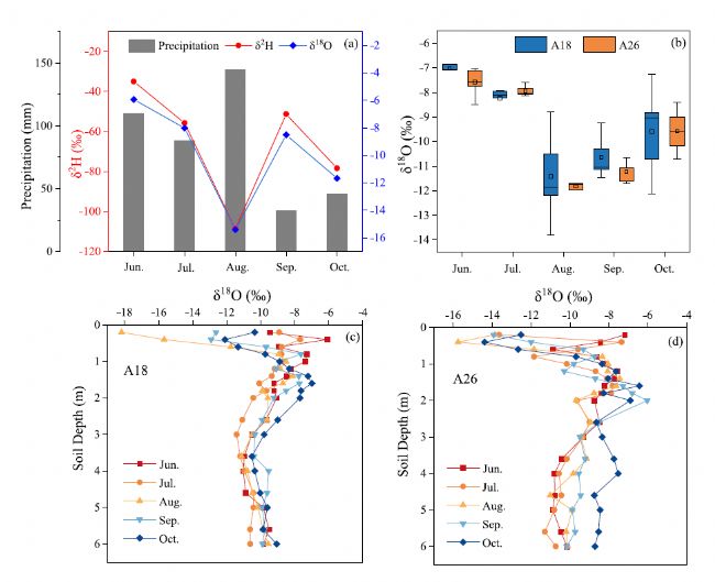 2020年降水(a)、木質(zhì)部水(b)和土壤水(c、d)同位素組成的季節(jié)變化。