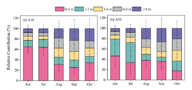 2020年生長季(a)18年生和(b)26年生蘋果樹不同層土壤水對木質(zhì)部水分的相對貢獻(采用2H18O與MixSIAR模型最佳組合)。