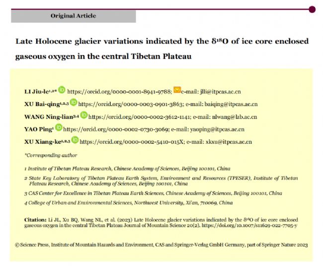 青藏高原中部冰芯氣泡δ18O指示晚全新世冰川變化