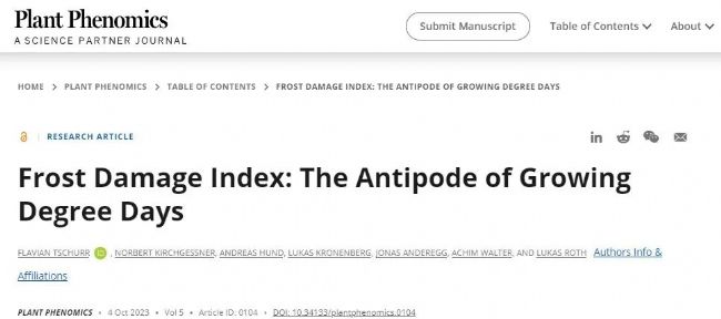 2023年10月,Plant Phenomics在線發(fā)表了瑞士Institute of Agricultural Sciences等單位題為 Frost Damage Index: The Antipode of Growing Degree Days 的研究論文。