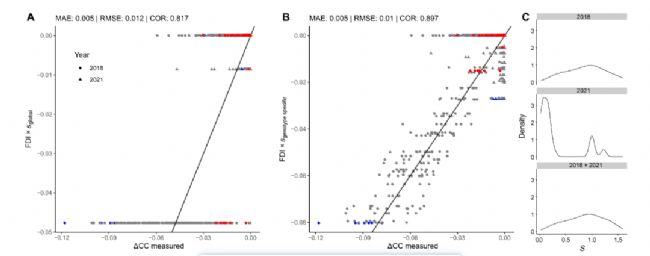 圖3 基于Frost Damage Index(FDI)預(yù)測的霜凍損害與冠層覆蓋下降(ΔCC,每個播種行測量)之間的關(guān)系