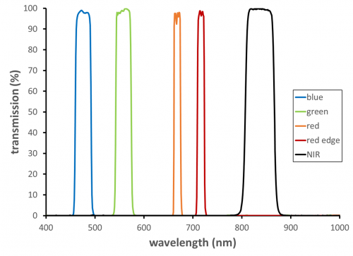 下面的濾光片示例通過(guò)使用4個(gè)單獨(dú)的濾濾光片/相機(jī)組合來(lái)計(jì)算作物的NDRE值,并計(jì)算NDRE的比率。這里涉及到的特定波段的比率和差異可以用于許多植物指數(shù)的計(jì)算。
