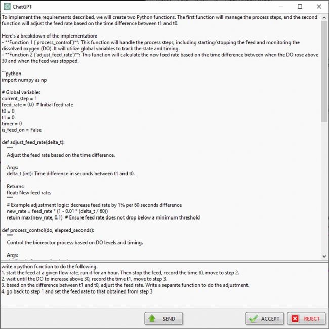 (2)根據(jù)提示向AI描述想要實現(xiàn)的生物工藝控制需求,包括輸入輸出參數(shù)、控制邏輯等。注意盡量用清晰、簡潔的語言,并且包含盡可能多的細(xì)節(jié),這樣有助于AI生成準(zhǔn)確的UDF代碼。