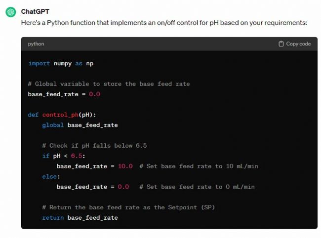 根據(jù)我們的測試,ChatGPT在處理簡單的邏輯時正確率非常高,例如針對pH值,基于開關(guān)控制的方式控制堿液補加,從而維持pH值在6.5:
