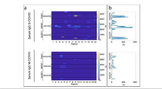 圖 2. 嚴(yán)重與輕癥COVID-19 患者血清IgG對(duì) DAB1、AIFM1 和 SURF1結(jié)合存在顯著差異。 a) 上方熱圖顯示血清 IgG 與三種神經(jīng)元自身抗原的表位結(jié)合是COVID-19嚴(yán)重患者 (S-COVID) 的特征,下方熱圖顯示大多數(shù)COVID-19輕度患者(M-COVID)不存在與相同自身抗原結(jié)合的IgG 。 b) a 圖中熱圖呈現(xiàn)的兩組患者免疫熒光強(qiáng)度值進(jìn)行平均,并根據(jù) DAB1、AIFM1 和 SURF1 的預(yù)測表位進(jìn)行繪圖,以便在嚴(yán)重和輕度患者之間進(jìn)行直接比較。 (FI=熒光強(qiáng)度)。