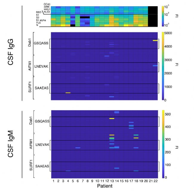 圖 3. 22 名嚴(yán)重感染 COVID-19 患者腦脊液針對(duì) DAB1、AIFM1 和 SURF1 的自身抗體。上圖顯示針對(duì)不同患者腦脊液IgG 與病毒蛋白的反應(yīng),中圖顯示腦脊液IgG 與所預(yù)測人類多肽序列結(jié)合,下圖顯示了腦脊液IgM結(jié)合相同序列的情況。 (FI=熒光強(qiáng)度)。