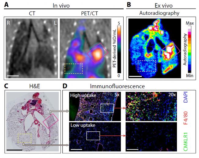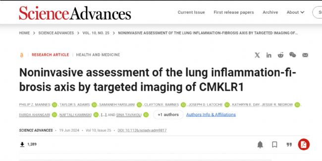 近日,匹茲堡大學(xué)在Science Advances雜志(IF:13.6)發(fā)表了題為“Noninvasive assessment of the lung inflammation-fibrosis axis by targeted imaging of CMKLR1”的文章,研究了cmklr1靶向的PET在小鼠纖維化肺損傷模型中監(jiān)測MDMφ積累動力學(xué)的潛力,并確定了其作為纖維化肺疾病內(nèi)分型和預(yù)后生物標(biāo)志物的臨床相關(guān)性。