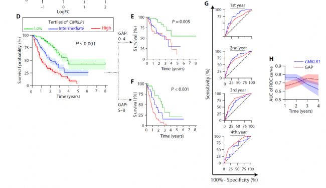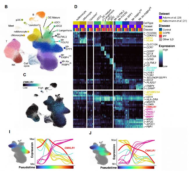 為研究CMKLR1在IPF肺免疫細(xì)胞中的作用,作者對兩個(gè)具有>300,000個(gè)免疫細(xì)胞的全肺單細(xì)胞RNA測序(scRNA-seq)數(shù)據(jù)集進(jìn)行探索分析。按不同表型,巨噬細(xì)胞被分為包含Alv-Mφ (FABP4Hi)和FABP4Int-Mφ的肺泡巨噬細(xì)胞,以及3組非肺泡巨噬細(xì)胞:SPP1- m φ組、FOLR2-Mφ組及罕見的OLFML3-Mφ群體。