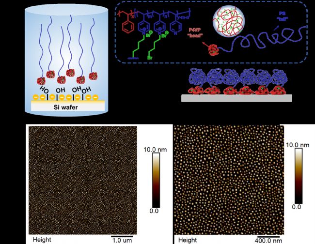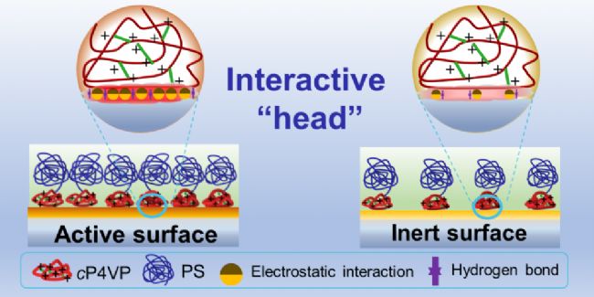 通過聚苯乙烯-b-聚(4-乙烯基吡啶)(PS-b-P4VP)嵌段的P4VP鏈內(nèi)交聯(lián)制備得到蝌蚪狀單鏈粒子(TSCP),可在硅片表面實(shí)現(xiàn)均勻接枝(圖1)。在接枝過程中,通過“頭部”與表面之間的多種相互作用的協(xié)同作用,“頭部”可以牢固地粘附在活性表面和惰性表面上;即使是接枝到惰性表面上,通過多種弱相互作用的集合和協(xié)同作用,TSCPs 仍能實(shí)現(xiàn)穩(wěn)定的接枝(圖2)。