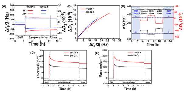 圖3 (A) TSCP-1和SV-Q-1的QCM-D吸附動(dòng)力學(xué),接枝濃度均為為0.2 mg/mL;(B) TSCP-1和SV-Q-1接枝過程中的ΔD vsΔf圖;(C) QCM-D監(jiān)測TSCP-1聚合物刷的溶劑穩(wěn)定性;TSCP-1和SV-Q-1在DMF中吸附的QCM-D厚度(D)和水合質(zhì)量變化(E)。