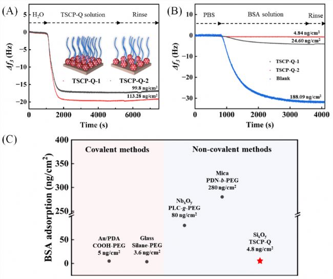 圖5 (A) TSCP-Q在在氧化硅芯片表面的吸附動(dòng)力學(xué)曲線;(B) BSA在TSCP-Q刷表面的吸附動(dòng)力學(xué)曲線;(C)TSCP-Q刷抗蛋白粘附的性能比較圖。