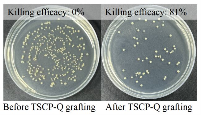 利用(S. aureus)對(duì)TSCP-Q接枝的硅片表面進(jìn)行抗菌評(píng)價(jià)。由于TSCP-Q的“尾部”PEG能夠動(dòng)態(tài)穿透細(xì)胞膜,并促進(jìn)細(xì)菌與TSCP-Q“頭部”的高密度季銨鹽接觸,所以TSCP-Q修飾的硅片對(duì)S. aureus體現(xiàn)出良好的抗菌性(81%)(圖7, 8)。